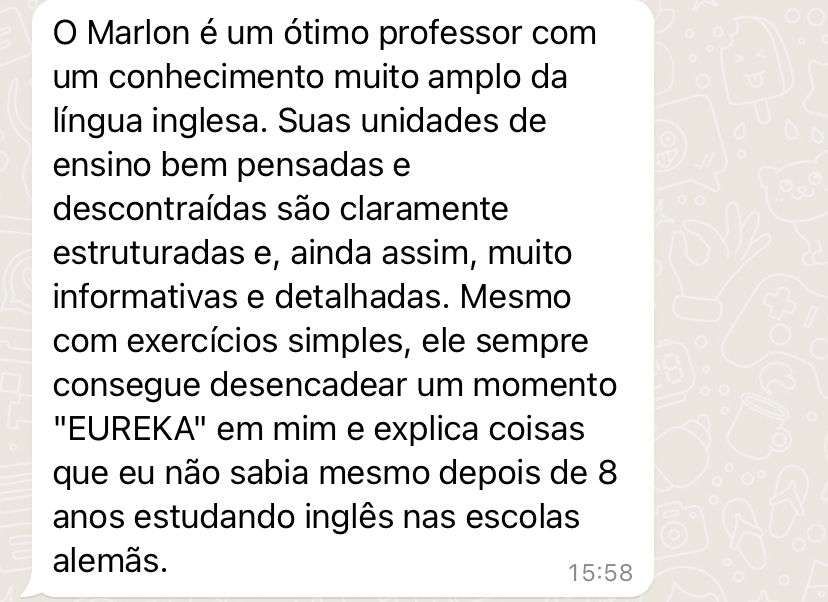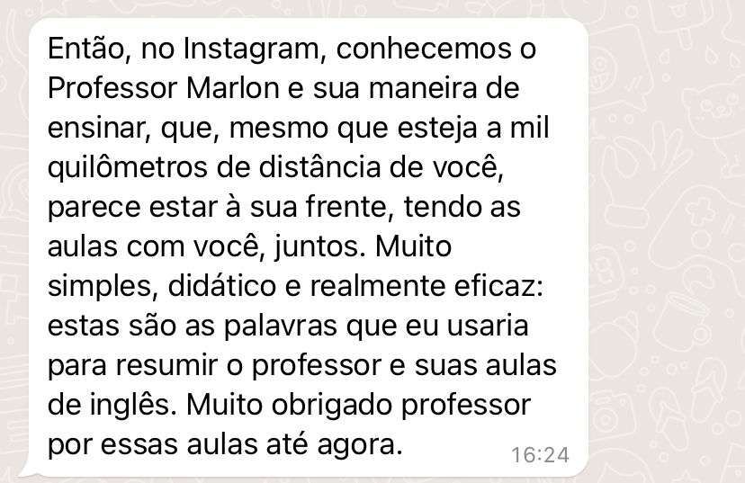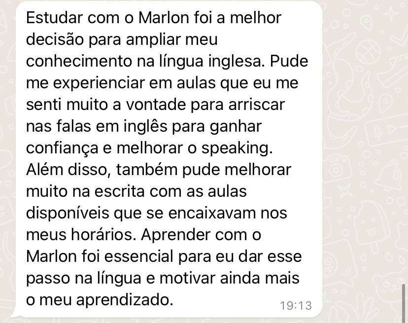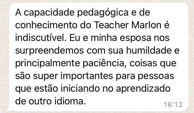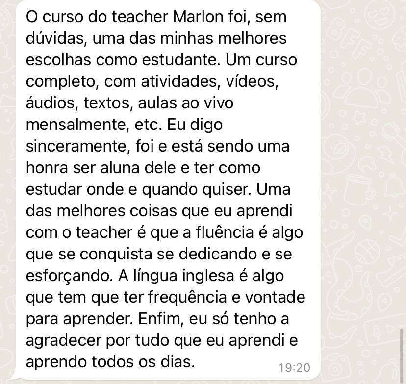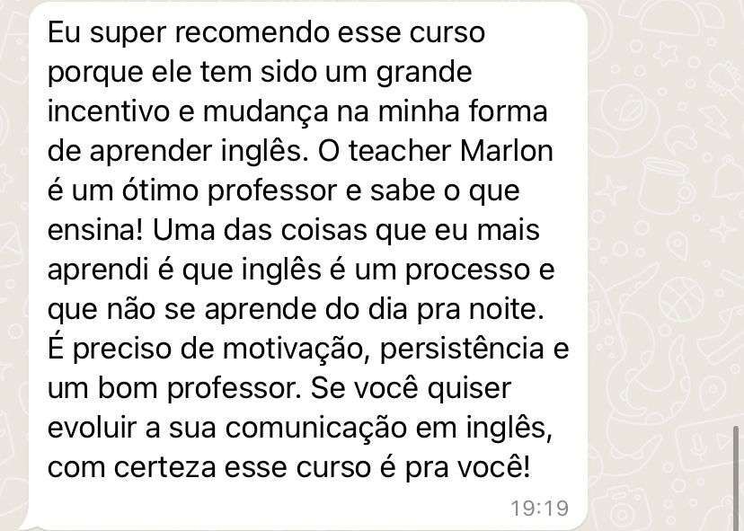 Teremos aulões MENSAIS ao vivo no ZOOM com todos os alunos. Será a sua vez de testar tudo o que você aprendeu e conversar muito em inglês com o próprio teacher Marlon! Serão combinados os dias, horários e assuntos no grupo exclusivo do curso no Telegram. A maioria dos cursos no mercado não possui aulas diretamente com professor. Então, conte com a ajuda constante do teacher nessa jornada.